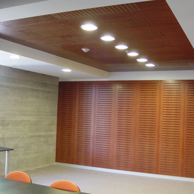 - Cielos y Revestimientos Lineales: Soluciones como la línea Woodlines o Natura Patagonia utilizan chapas de madera natural sobre almas tecnológicas (metálicas o de madera aglomerada) que combinan la nobleza estética con una instalación sencilla y un rendimiento excepcional. Permiten crear cielos y muros de aspecto lineal, aportando una calidez visual inigualable, mientras optimizan la acústica y la funcionalidad del espacio.