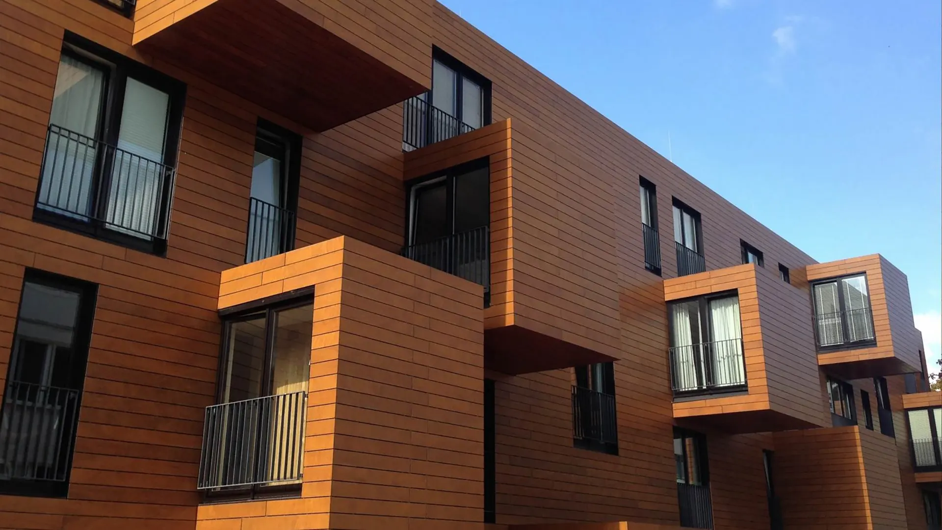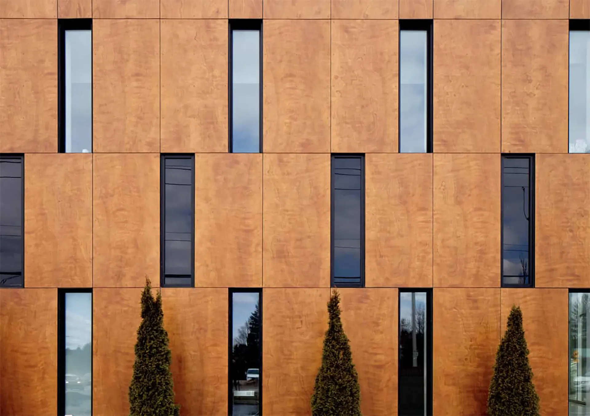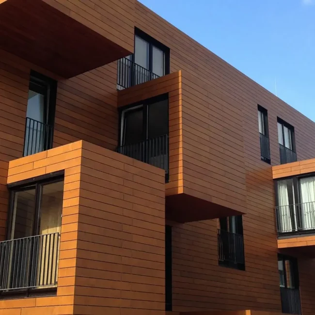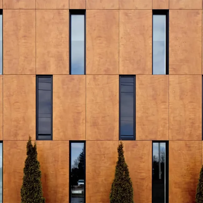 - Fachadas de Alta Resistencia (Parklex Prodema): Para revestimientos exteriores que exigen máxima resistencia, existen paneles con textura de madera desarrollados con cuerpos de baquelita de alta densidad. Estos sistemas son ideales para fachadas ventiladas, ofreciendo una excelente resistencia a los agentes climáticos sin sacrificar la estética orgánica.