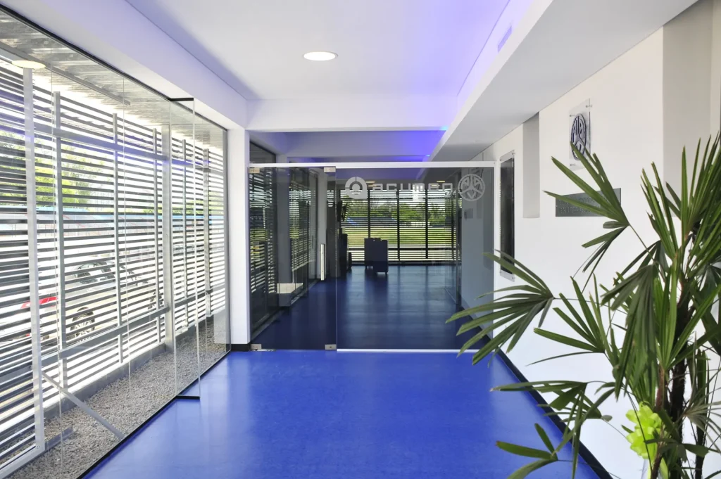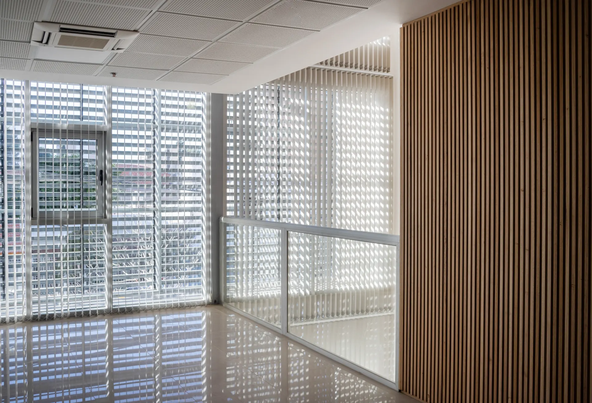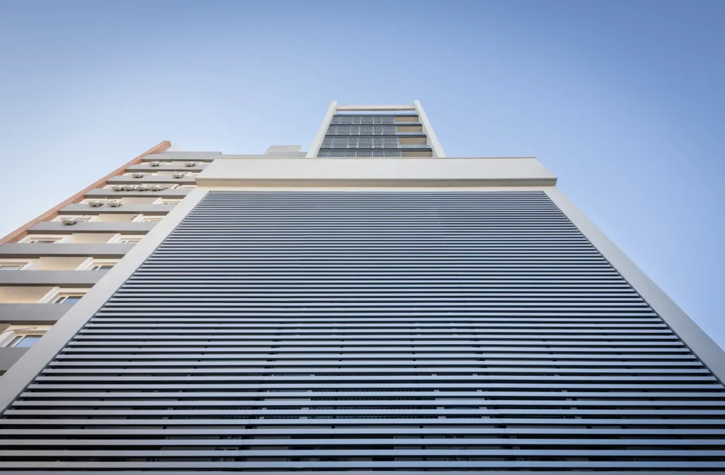 • Control Solar y Ventilación: Actúa como una eficaz barrera para la radiación solar directa, ayudando a reducir la carga de calor en el interior del edificio. Su diseño de separación variable entre los paneles permite un control preciso de la visión y del intercambio de aire.