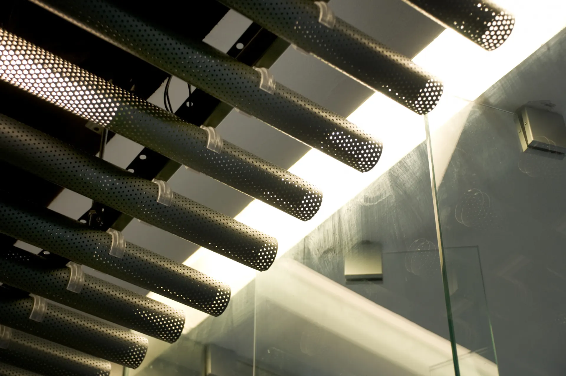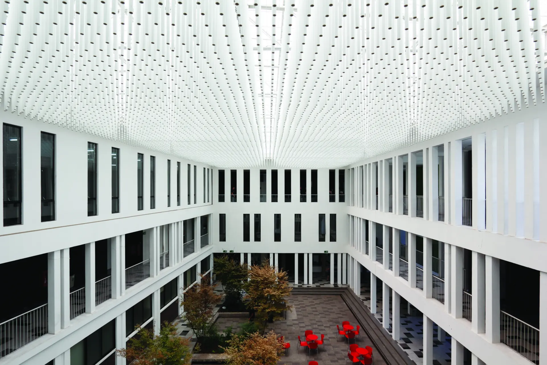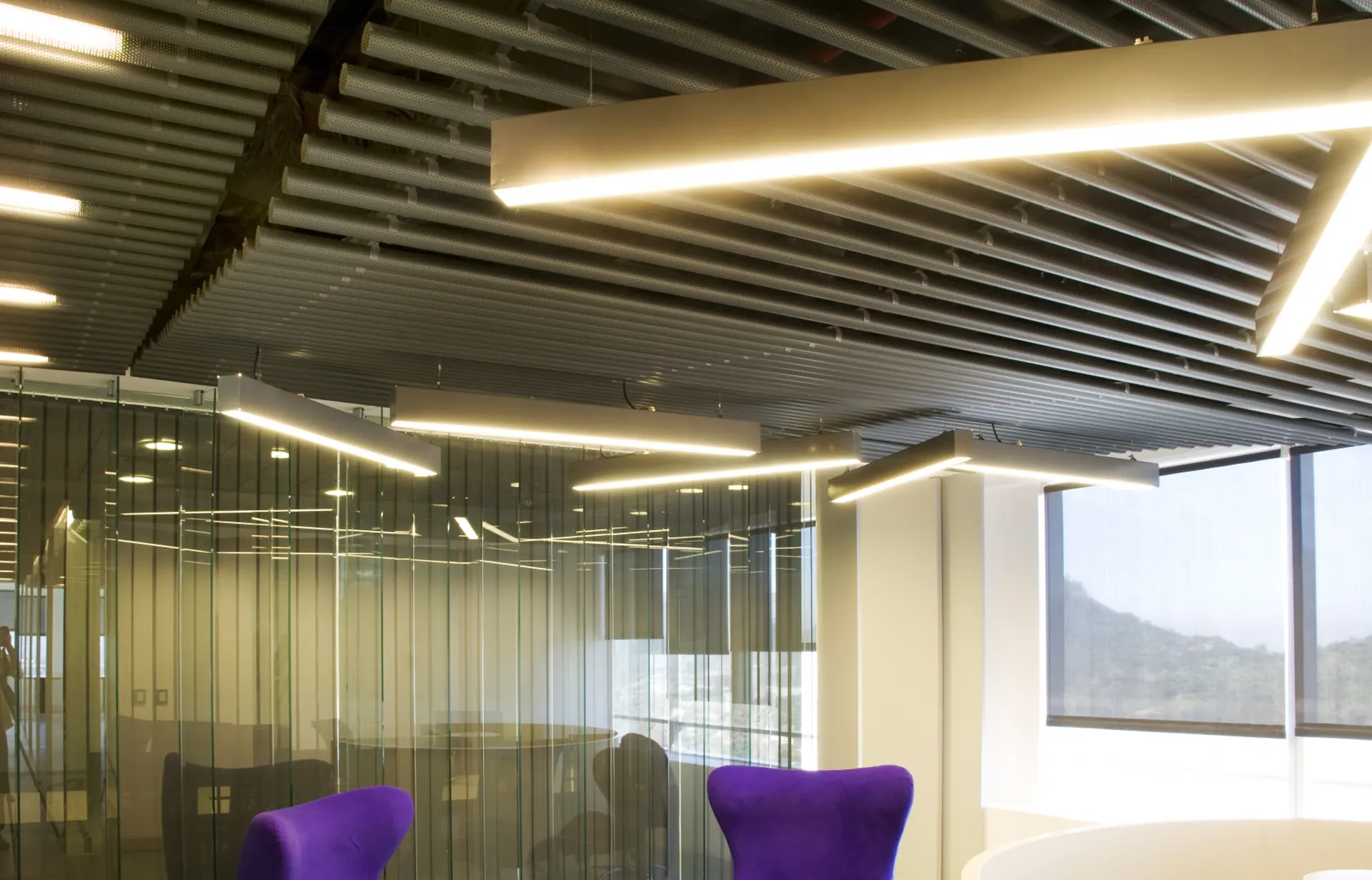 - Uso dual: Puede funcionar como un cielo interior con fácil acceso al pleno para mantenimiento, o como un eficiente cortasol cenital, proporcionando control solar y una terminación estética.